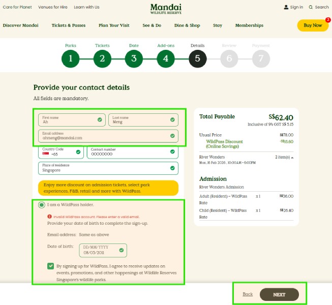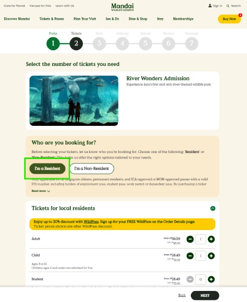 When buying admission tickets, select "I'm a Resident" at Step 2 (Tickets) to unlock WildPass-discounted ticket prices. At Step 5 (Details), fill in your contact details and check "I am a WildPass holder" — then enter your date of birth and consent to receive updates on events, promotions, and happenings at Mandai Wildlife Reserve.