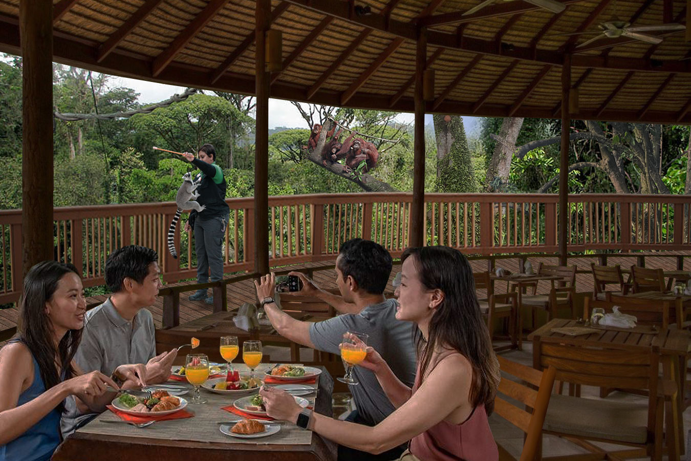 In the mornings, the upper floor outside the bistro will also be abuzz with Singapore Zoo’s signature dining programme, Breakfast in the Wild. The design incorporates the surrounding tree-line where the orangutans climb and explore in the tree canopy. From an elevated terrace, diners will be able to look out to the animals up amidst the trees and interact with the keepers to learn about the orangutans and other species.
