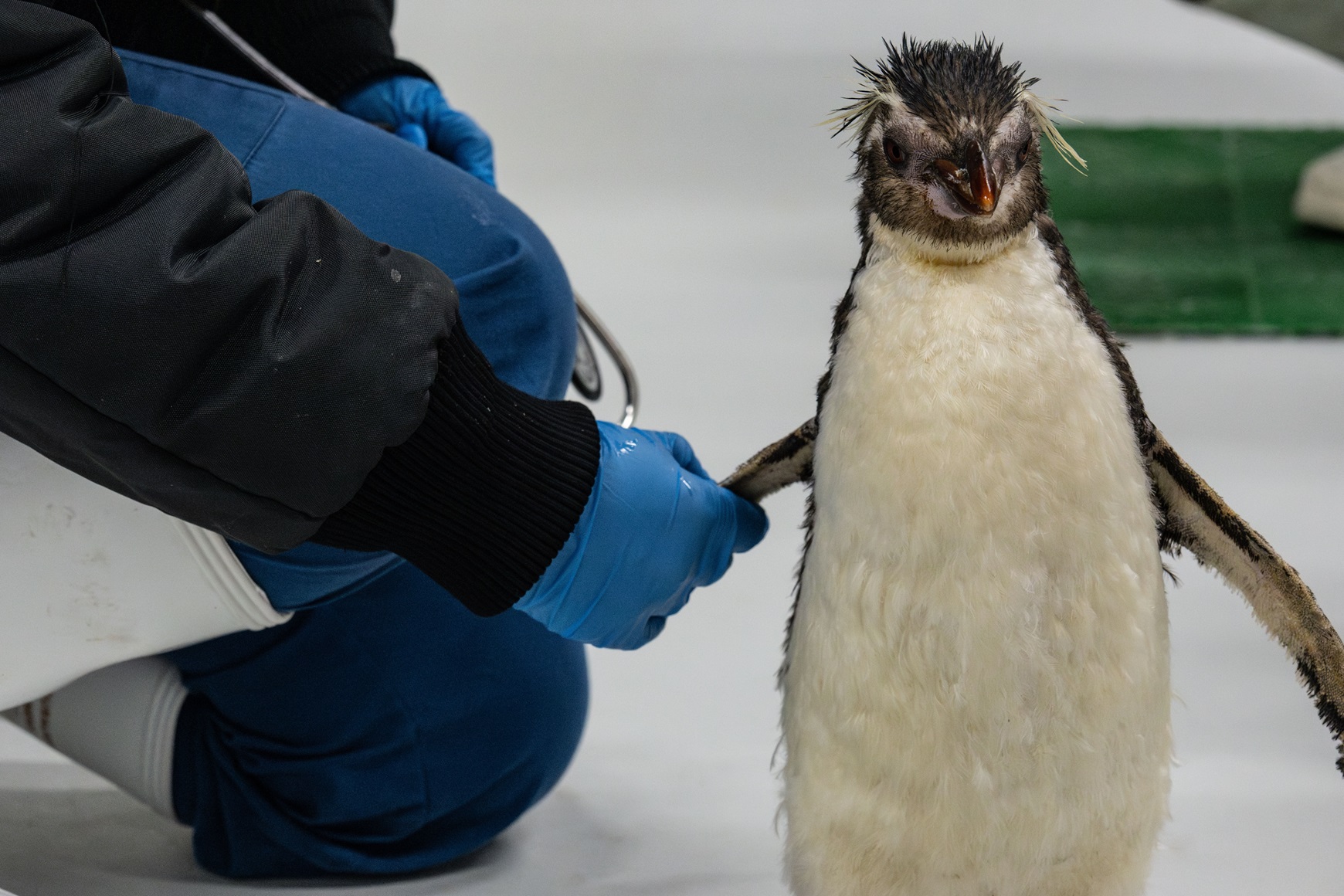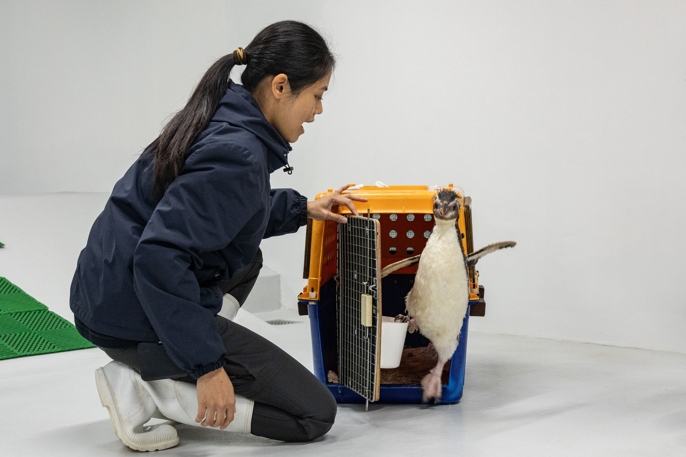Penguin keeper, Nuralyanti Jasni, releases Pascale from her crate upon arrival at Bird Paradise. Pascale will undergo a two-week isolation period for monitoring to ensure she is adjusting well to her new environment.