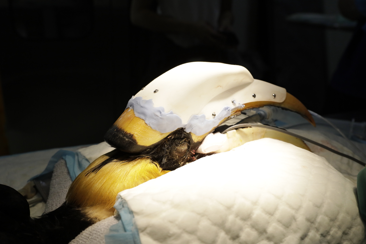 A Great Pied Hornbill diagnosed with an aggressive form of cancer has been given a fighting chance to survive, following a surgery to outfit it with a 3D-printed prosthetic casque.