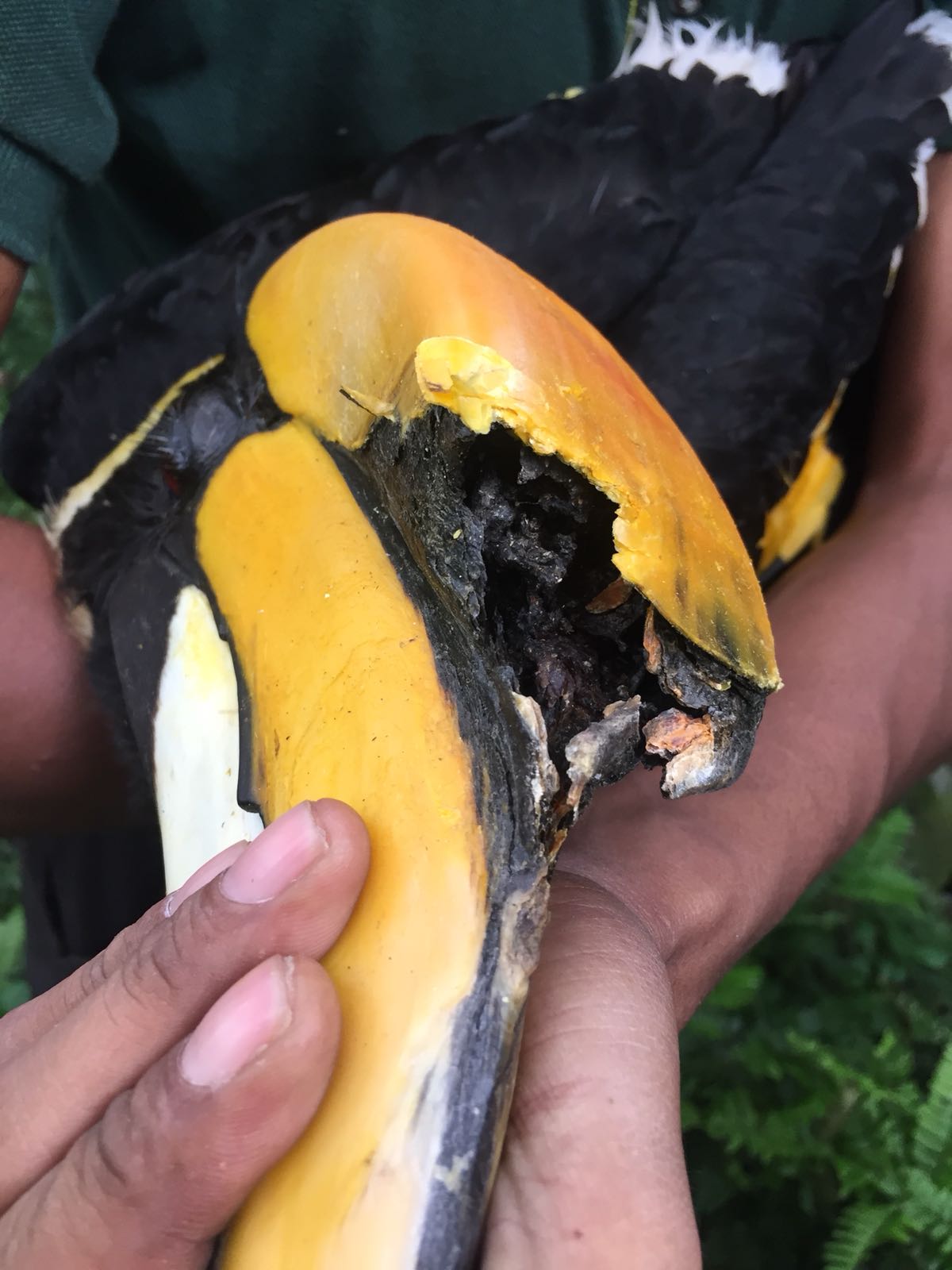 On 13 July, Jurong Bird Park’s keepers noticed one of the Great Pied Hornbills in their care had an estimated 8cm wide gash on its casque, exposing the underlying tissue. The veterinary team formed a guarded prognosis as the park has seen two similar cases in the past. Of these two cases, one underwent chemotherapy, which unfortunately did not save the bird, while the other hornbill’s cancer had progressed too rapidly for treatment.