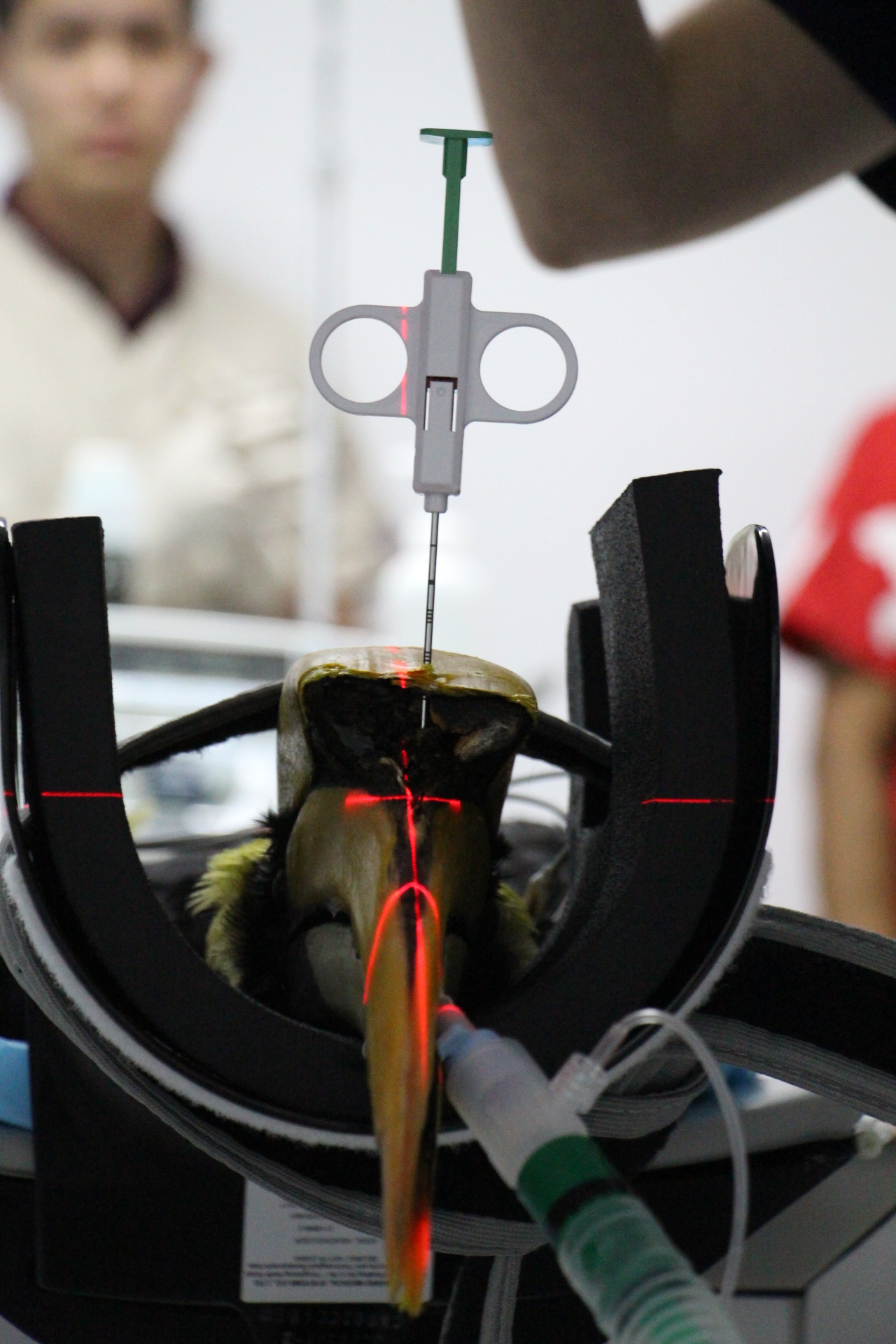 Dr Hsu Li Chieh using a drill guide to affix the 3D-printed casque onto Jary. This prosthesis will be on the hornbill until a new casque grows out.