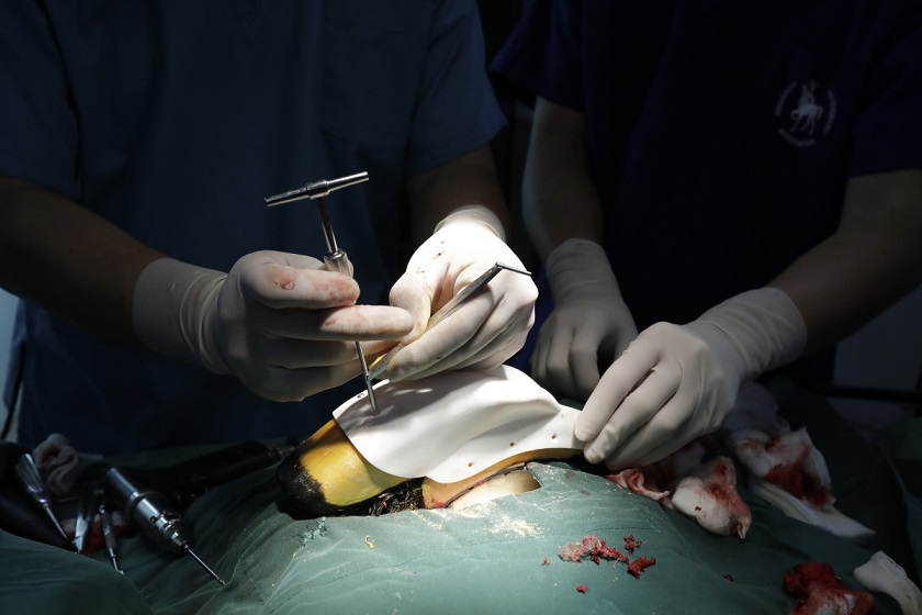 Honorary consultant Dr Hsu Li Chieh from The Animal Clinic, in the process of removing part of Jary’s casque with an oscillating saw.