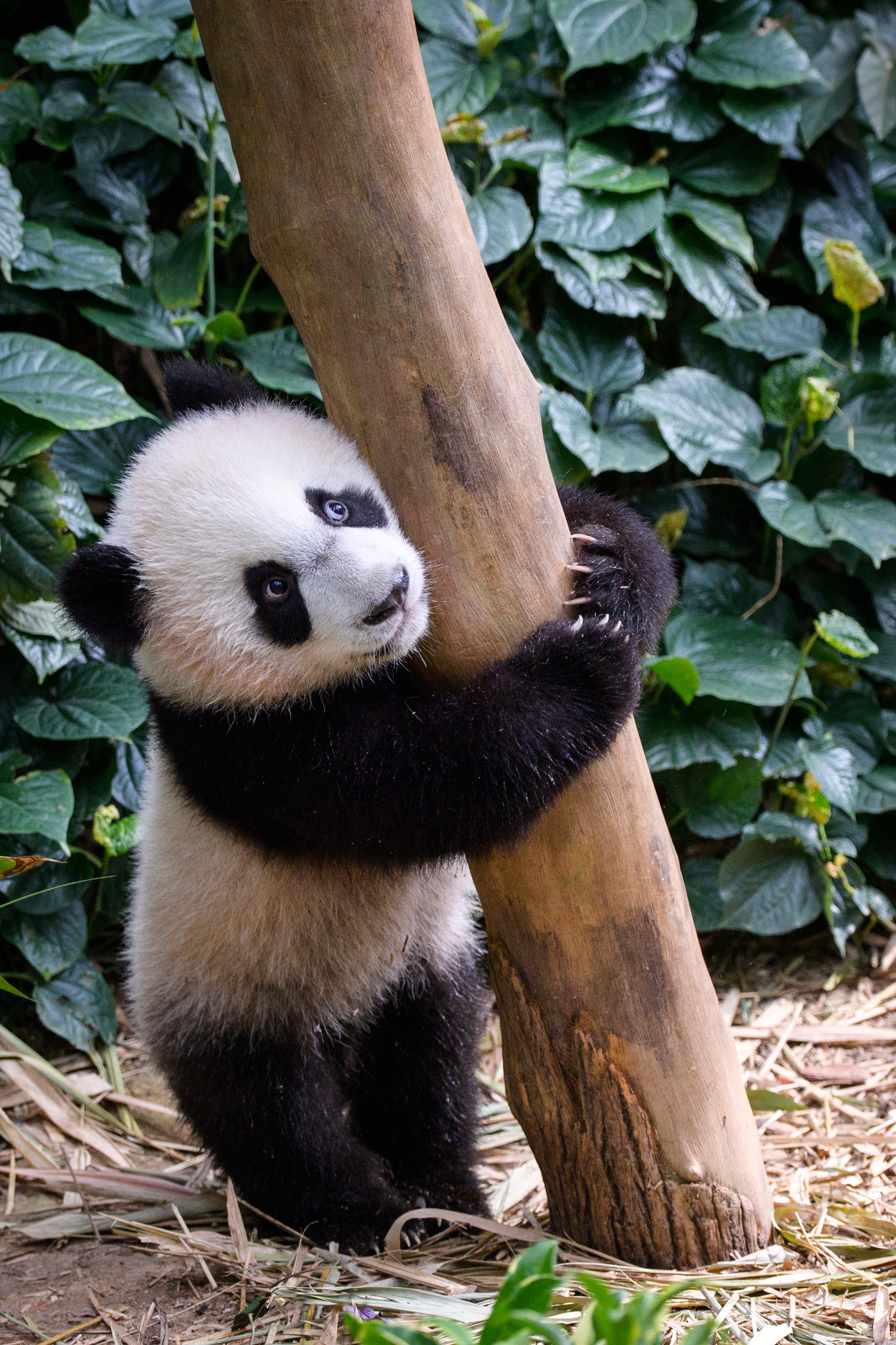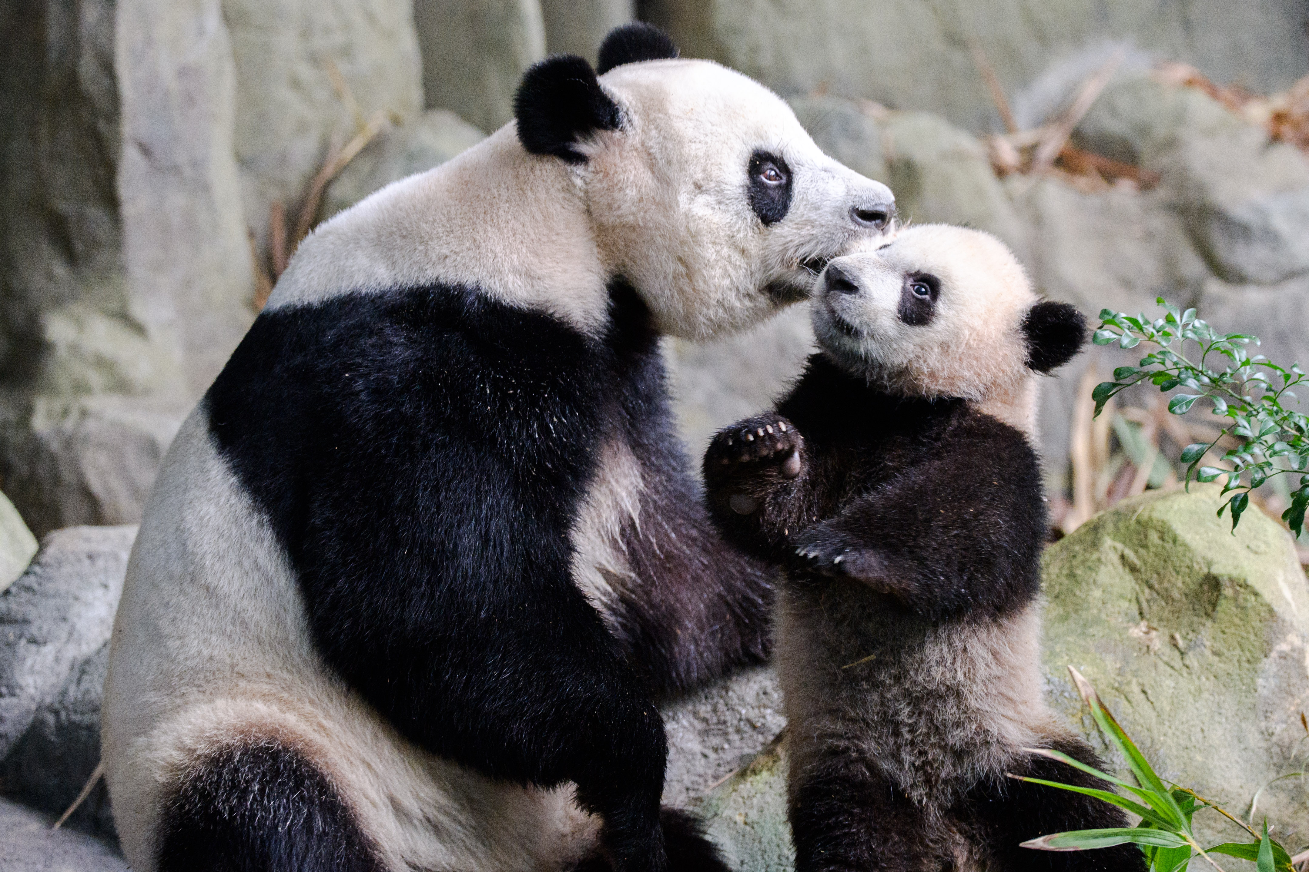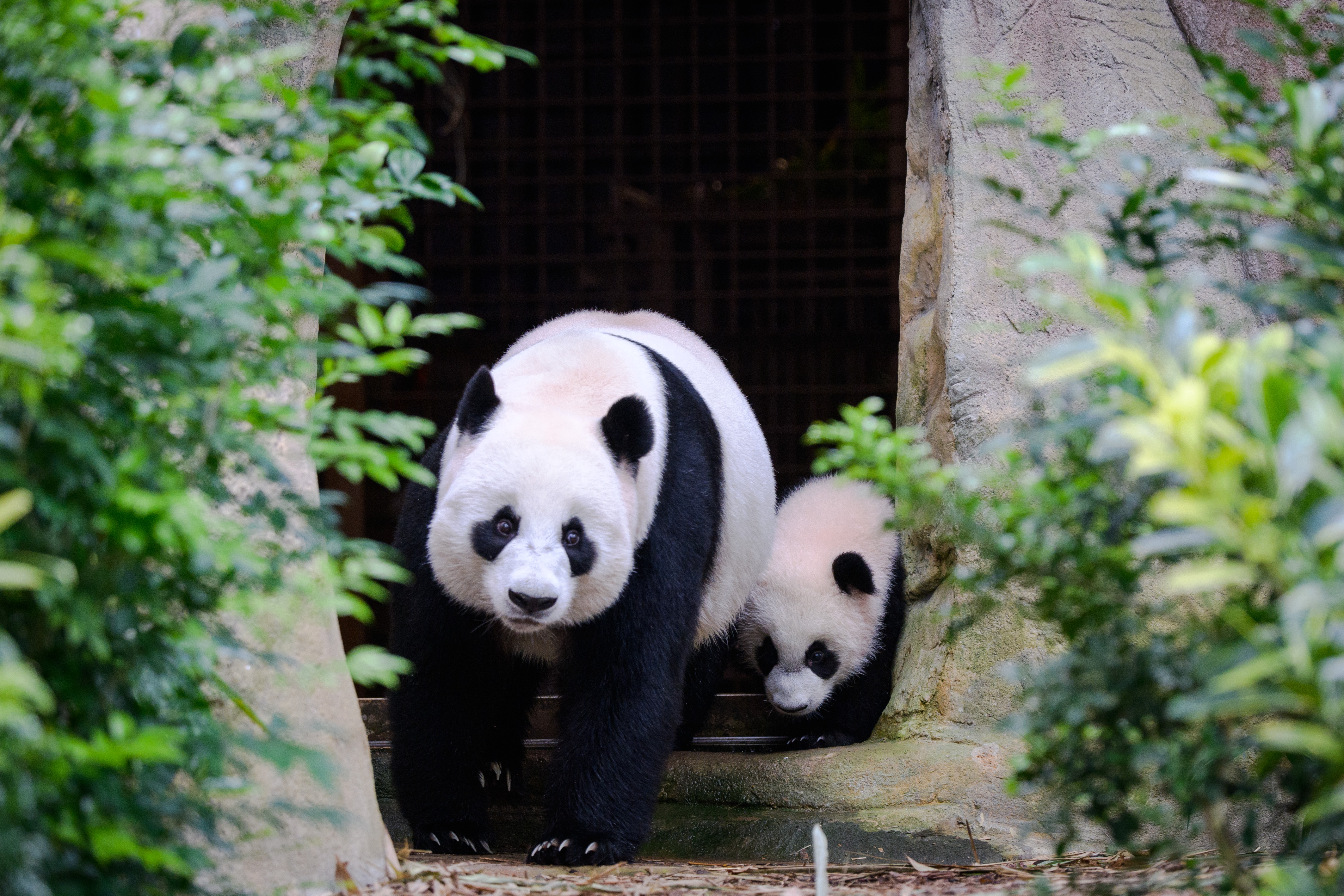 To prepare for Le Le joining mom in the exhibit, some degree of ‘baby proofing’ was necessary. Anticipating the curious cub will explore the grounds and get his paws on the various elements within the habitat, the animal care team assessed the space and removed any potential risks to ensure his safety. A key modification was draining the water area, which is now filled and padded with leaves and pine bark chips. Aside from being able to spend quality time with Jia Jia throughout the day, Le Le also enjoys exploring his new space independently to continue his spirited adventures in climbing and investigating every area of their exhibit. He has even tried his paws at enrichment devices, all under mom’s watchful eye.