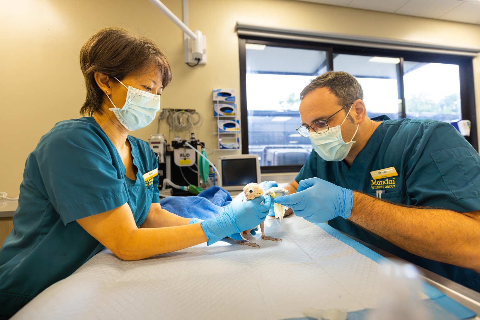 Keiko Watanabe, Deputy Head Keeper, and Dr Daniel Calvo, Assistant Vice President of Veterinary Healthcare & Scientific Programmes at Mandai Wildlife Group, examine the chick at Bird Paradise’s Avian Hospital.