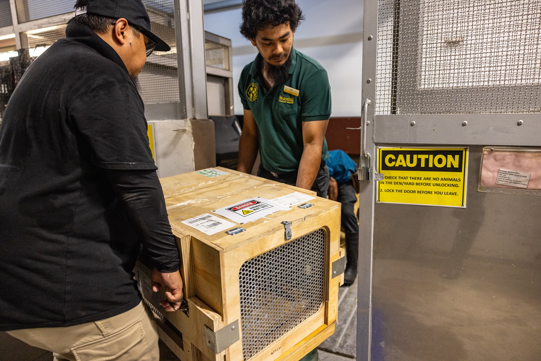 A team from Night Safari, including Razak Jaffar, Assistant Curator, Animal Care (Operations), Mandai Wildlife Group (left) and Alif Bin Mohd Ghazali, Keeper, Animal Care (Operations), Mandai Wildlife Group (right), received the animals.