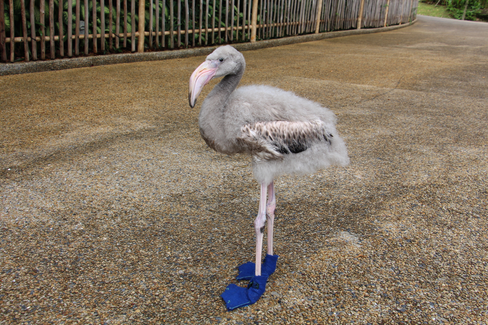 Squish showing off its signature blue shoes while on one of its walks to strengthen its legs. Abandoned as an egg, Squish the greater flamingo hatched on 7 June 2017and was raised by human carers at Jurong Bird Park’s Breeding and Research Centre.