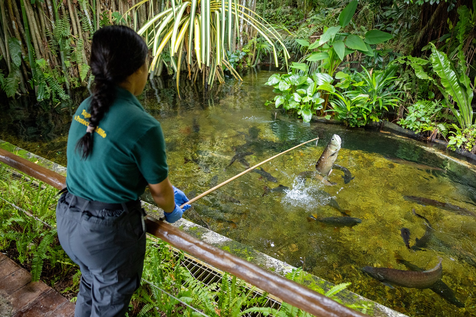 At the Wild Amazonia Keeper Talk, guests can observe a keeper feeding the silver arowana and even have a go at it. This species is nicknamed ‘water monkey’ as it can leap up to a whopping 2m above water to catch its prey.