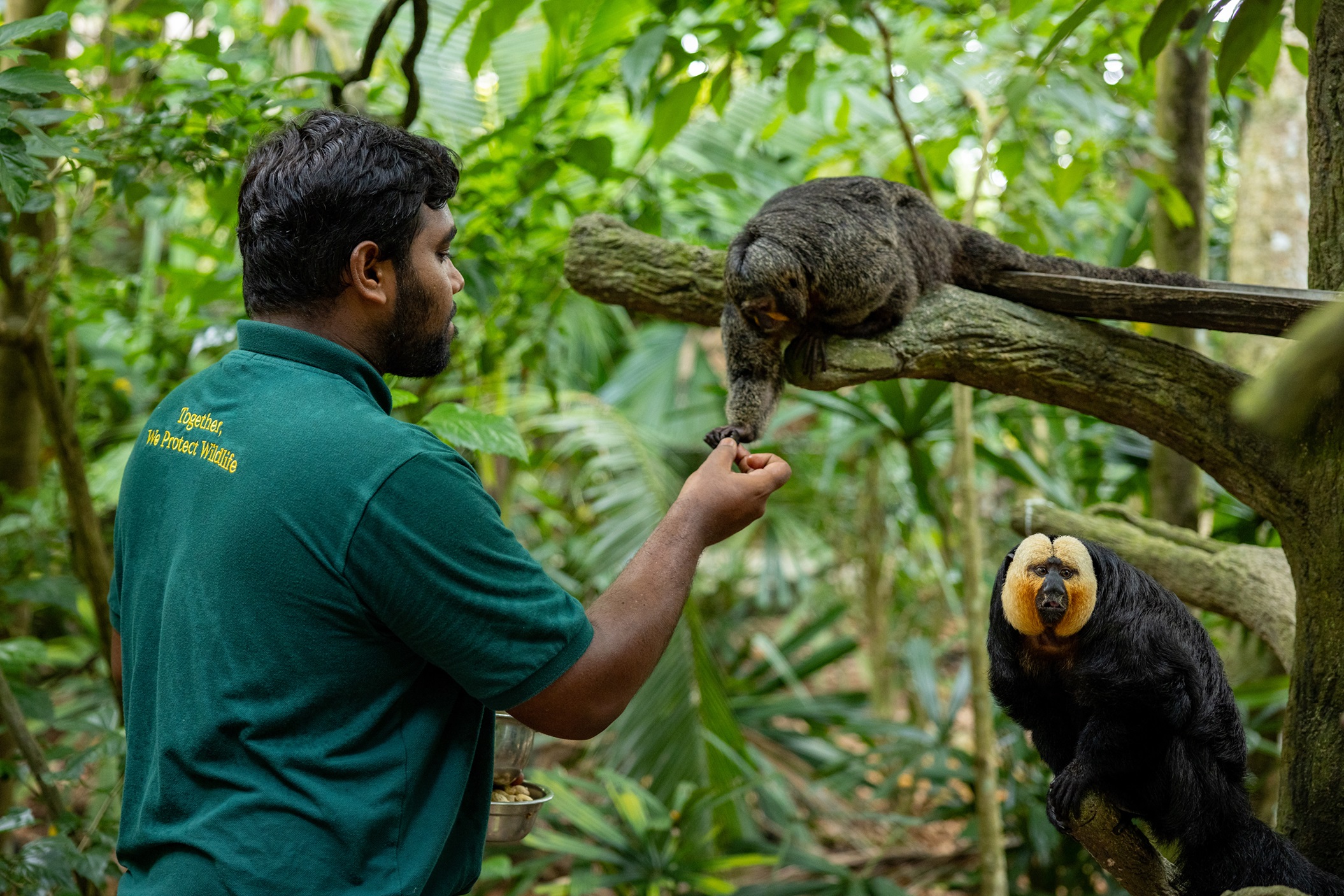 The Wild Amazonia Keeper Talk will also bring guests to Amazonia Encounters, an immersive walk-through exhibit home to species such as the white-faced saki monkey, green-winged macaw and Azara’s agouti. Pictured is a female white-faced saki monkey reaching for a nut from her keeper, while a male with the distinctive ‘white mask’ perches nearby.