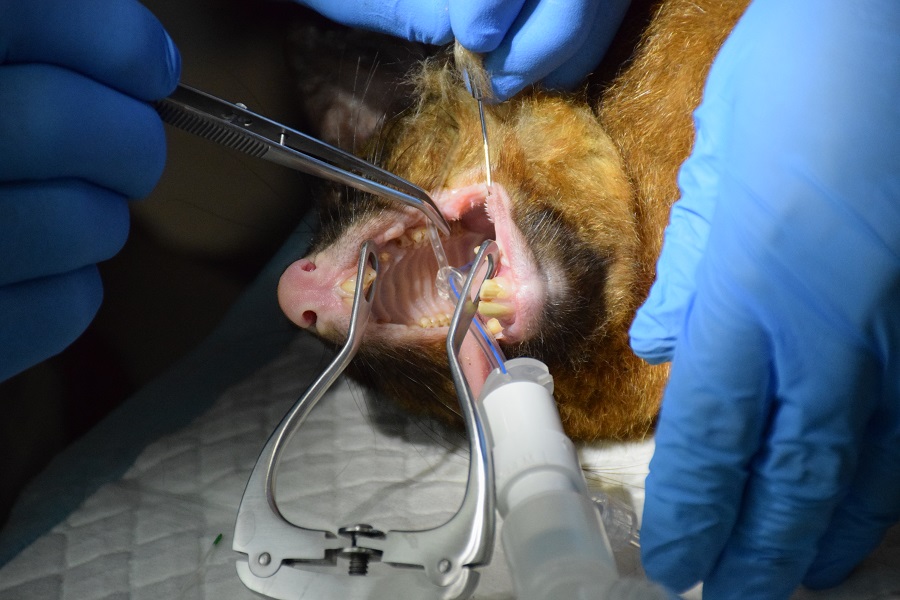 Night Safari’s Brushtail possum getting its teeth examined.