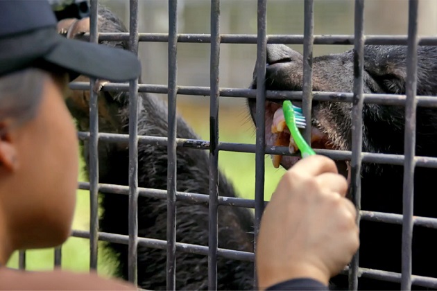 Night Safari’s Asiatic black bear gets its teeth brushed by its keeper. Operant conditioning is used by WRS keepers to train its animals to get accustomed to health checks without sedation. In some cases, daily teeth brushings are part of the animal’s overall care routine. Conditioning reduces stress for the animals who voluntarily participate in the procedures