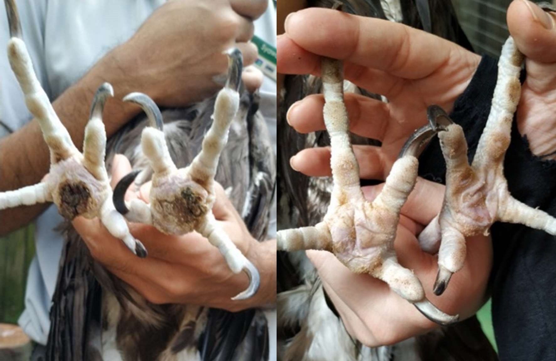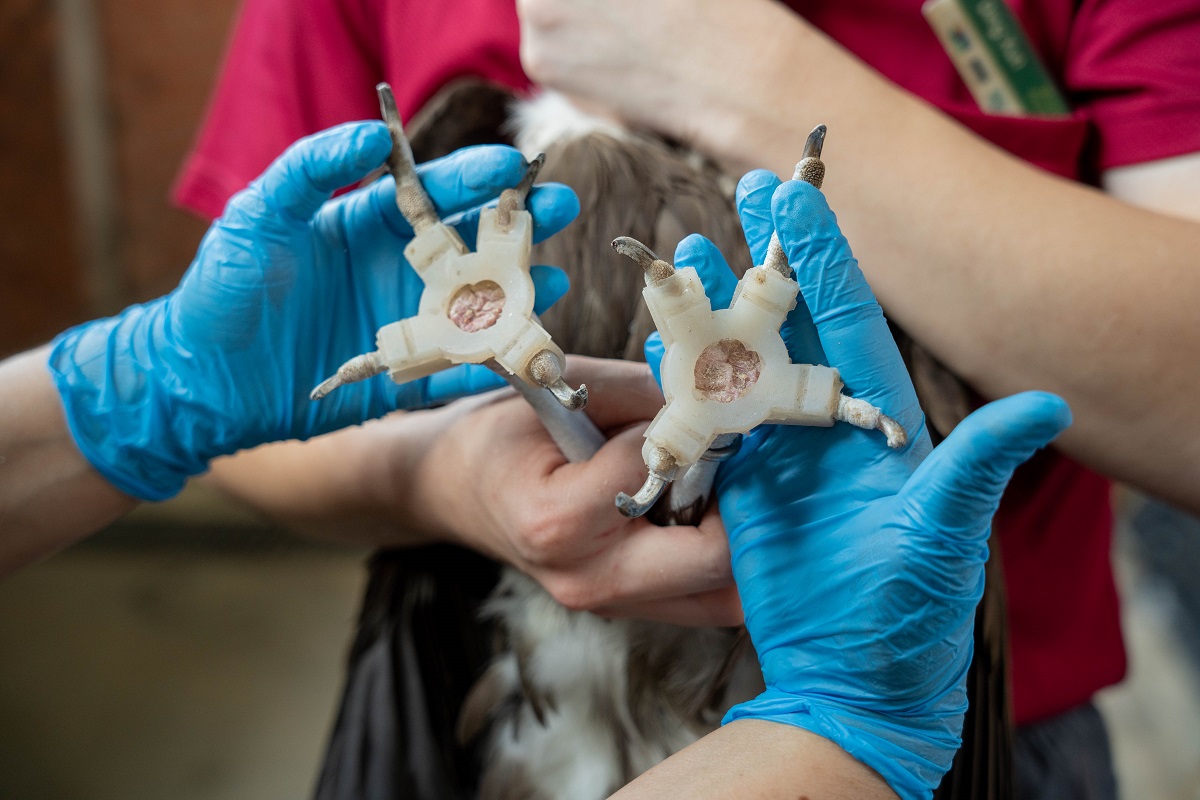 A comparison of Walter the hooded vulture’s feet before and after her first treatment with the shoes in 2019. The pressure sores in the center of her feet cleared up after 17 weeks of wearing the shoes. Native to Sub-Sharan Africa, hooded vultures are critically endangered in the wild.