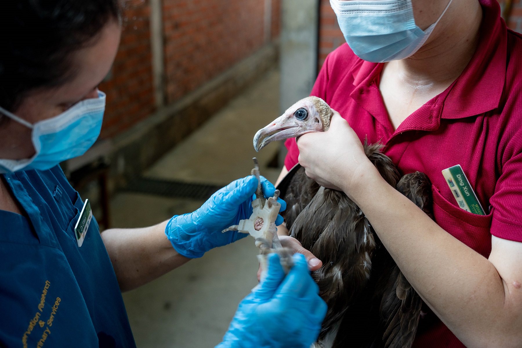 Dr Ellen Rasidi, veterinarian, Jurong Bird Park, checks on the progress of Walter the female hooded vulture’s recovery from bumblefoot, with the assistance of trainer-presenter Guo Ding Xun. After wearing her customised silicone shoes casted from 3D printed moulds for a combined period of five months in 2019 and 2021, Walter’s condition has seen a marked improvement.