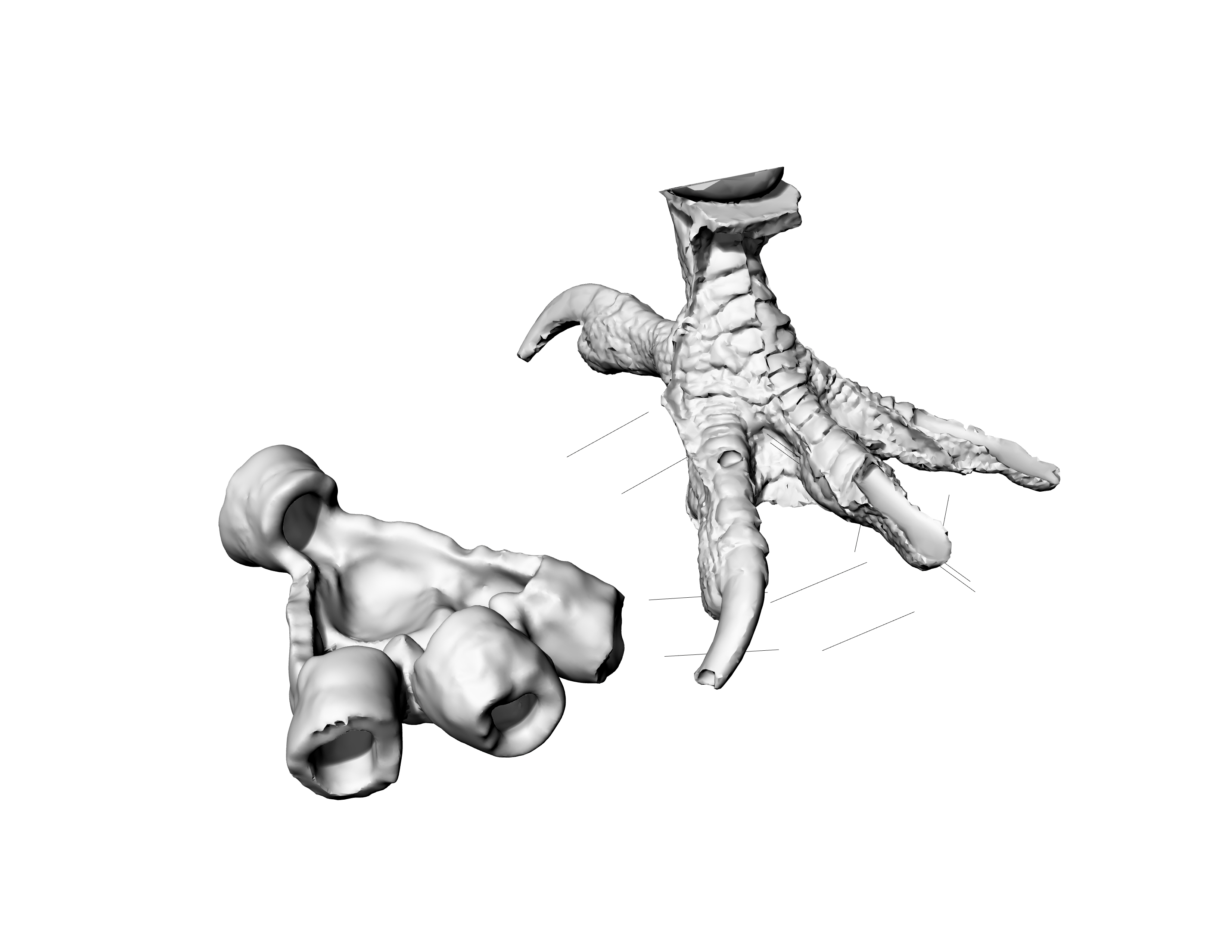 An early prototype of the shoe design printed directly from 3D processed dimensions. A 3D printer is able to print with flexible materials to accommodate the movement of bird feet but such materials lack elasticity, and shoes made from such materials are difficult to put on and are less durable.