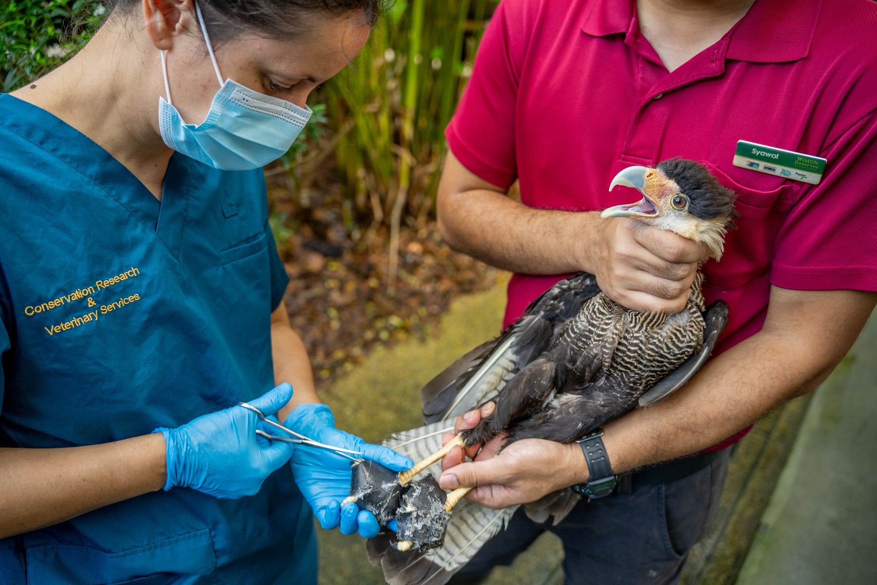 Veterinarian Dr Ellen Rasidi removes Miguel the Southern caracara’s shoes, before his discharge into Jurong Bird Park’s retirement aviary. His feet are wrapped with additional bandages and tape over the shoes to secure it further and prevent him from picking at them with his sharp beak.