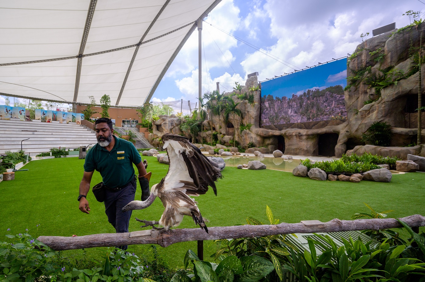 Chandramohan, Manager, Animal Behaviour & Programmes, working with a White-backed Vulture as part of preparations for the new Predator on Wings presentation at the brand new Sky Amphitheatre.