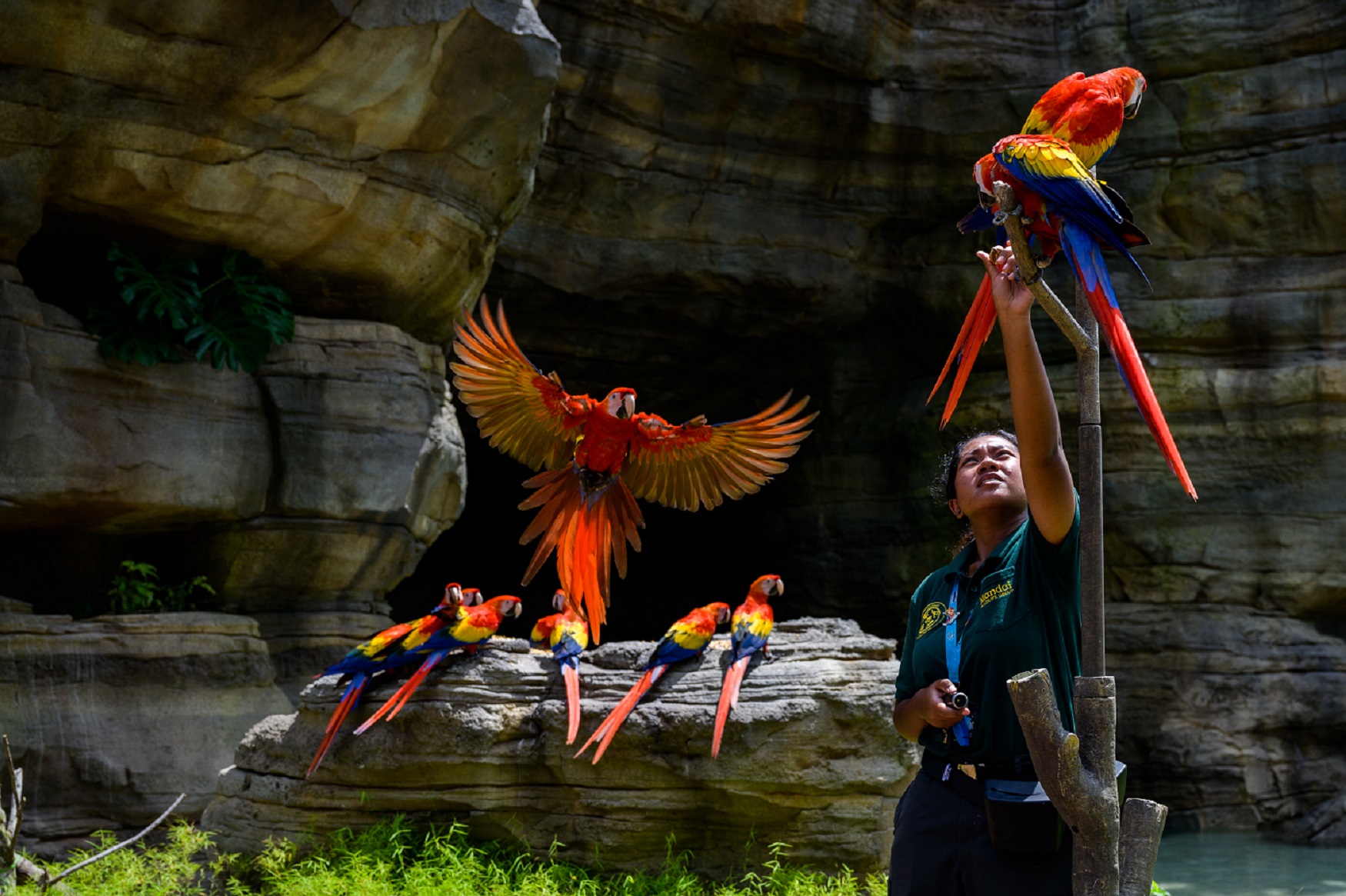 It is a visual extravaganza of pink and red at Hong Leong Foundation Crimson Wetlands, with species like the Scarlet and Red-and-green Macaws, Scarlet Ibises, Roseate Spoonbills and American Flamingos. Look up above and see flocks of macaws take flight with their loud, raucous calls, producing a symphony of noise. Songs of the Forest and Australian Outback get a boost with additional mammal species such as the Lesser Mousedeer and Red-necked Wallaby, respectively. Home to over 40 species of songbirds, immerse in the beautiful warblings of the Chinese Hwamei, Bali Myna and Straw-headed Bulbul, and spot the extraordinarily coloured fruit doves at the Songs of the Forest or revel in the lively chatter of a multitude of lorikeet and parrot species like the Scaly-breasted Lorikeet, Major Mitchell’s and Red-tailed Black Cockatoo in Australian Outback.