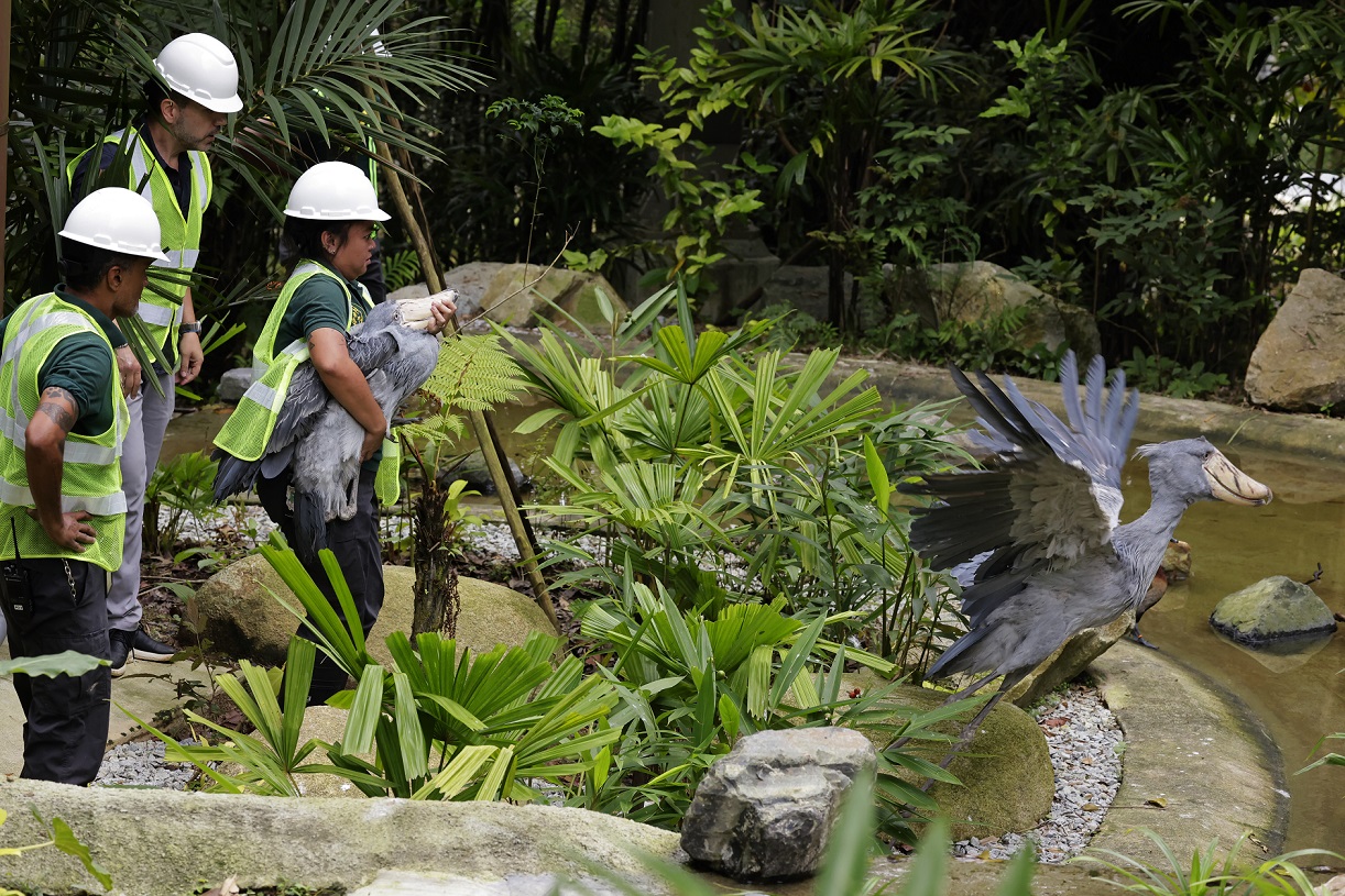 The Shoebills are released to their new habitat in Heart of Africa at Bird Paradise by the Animal Care team. The team will keep a close eye on the birds over the next few days to ensure they are adjusting to the environment.