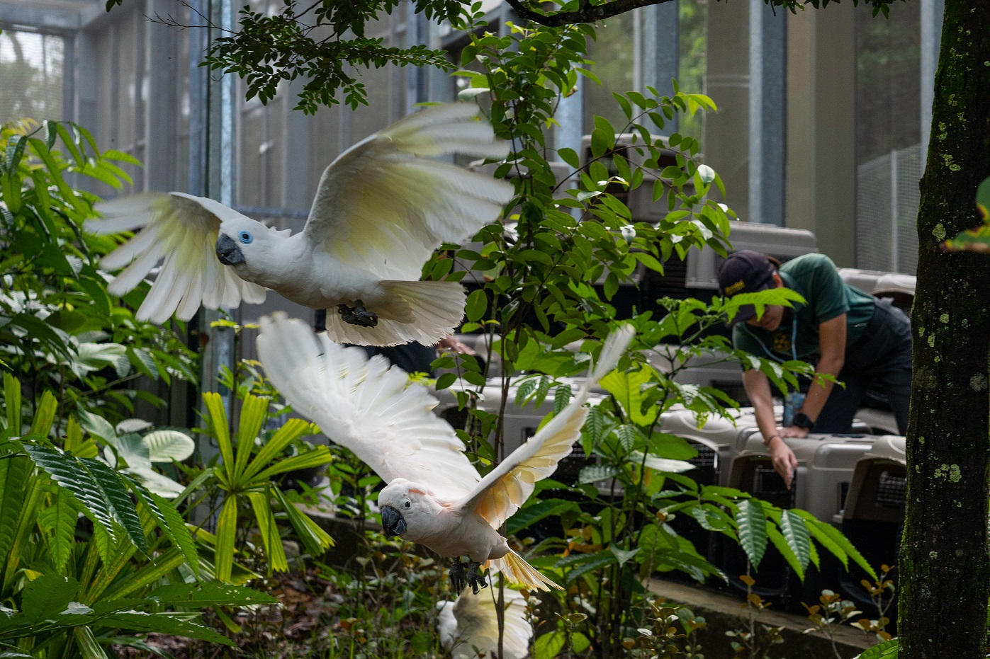 Threatened cockatoo species like the Blue-eyed Cockatoo (above) and Moluccan Cockatoo (below) being released at Mysterious Papua.