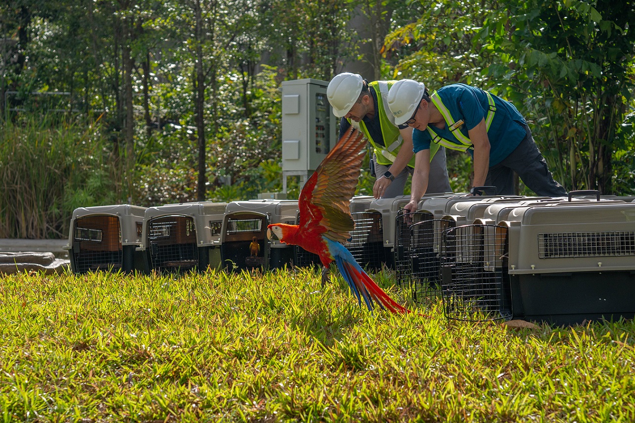 Scarlet Macaws being released into Hong Leong Foundation Crimson Wetlands, under the careful monitoring of the animal care and veterinary teams.