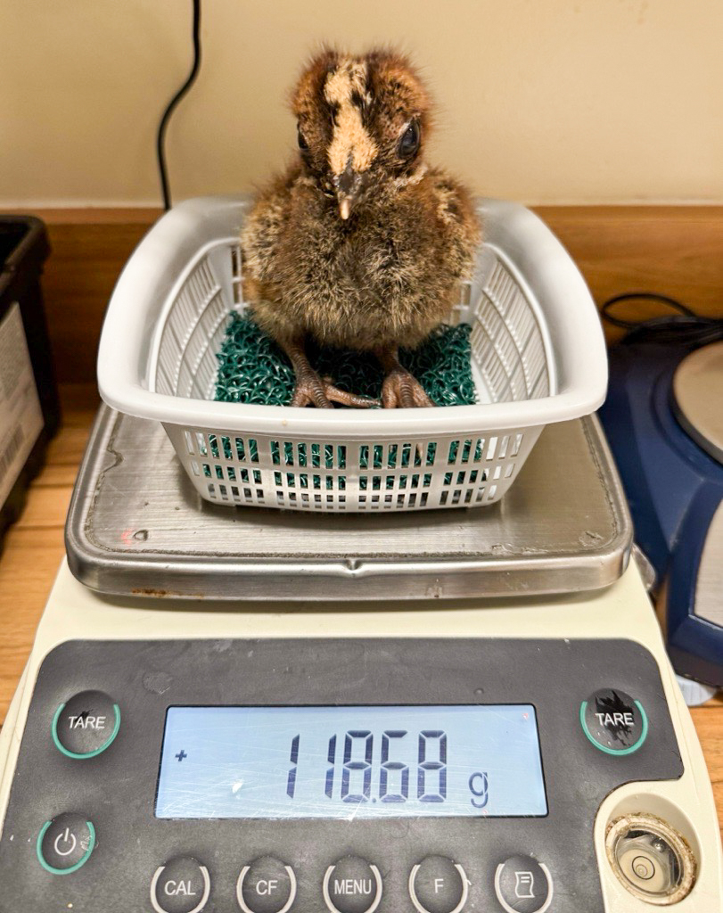 The chick perches calmly in a basket as its weight is recorded on Day 12.