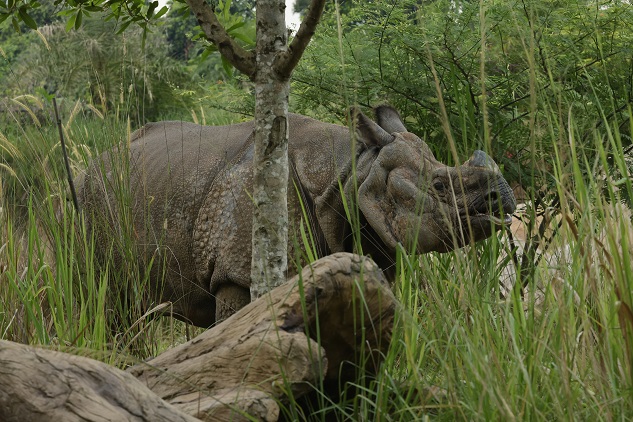 7-year-old male Indian rhino Thulie explores his surroundings in Night Safari’s new exhibit, planted with trees native to India and tall grasses to simulate the grassland habitat of his species. Thulie and Newari will make their official exhibit debut in Night Safari on 29 April 2021, where guests will be able to see them while on their tram journey or the walking trail.