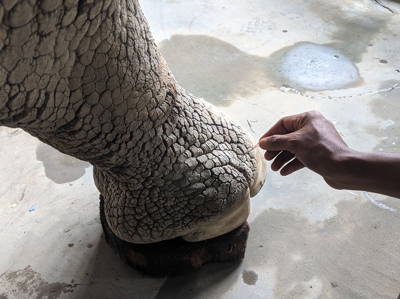 Keepers apply pressure using a blunt needle on Thulie’s skin. This is to get the animal used to the sensation while it stays still, to minimise stress when an actual blood draw procedure needs to be carried out.