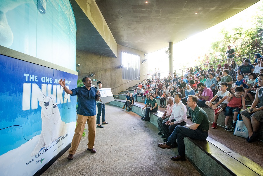Mr Alan John introduces his book ‘The One and Only Inuka’ to an audience there to celebrate the famed polar bear’s life on what would have been his 28th birthday. Among the audience is (from right) Mr Mike Barclay, Group CEO, Mandai Park Holdings, Guest of Honour Mr Ong Ye Kung, Minister of Education, and Mr S Dhanabalan, Chairman, Mandai Park Holdings.