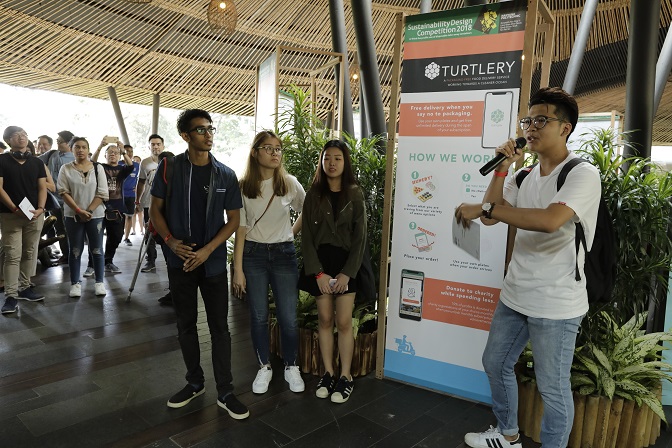 Students from Nanyang Polytechnic presenting their idea that won first place in the Sustainability Design Competition—Turtlery—a food delivery service that incentivises users to opt out of single-use packaging by offering heavy discounts and donations to a cause of their choosing.