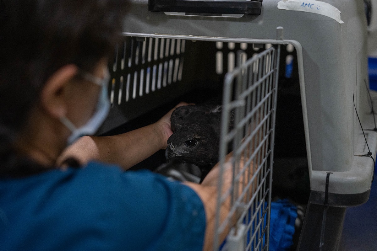 Dr Ellen puts the changeable-hawk eagle in a carrier overnight for it to rest and get used to its new feathers before its release the next day.