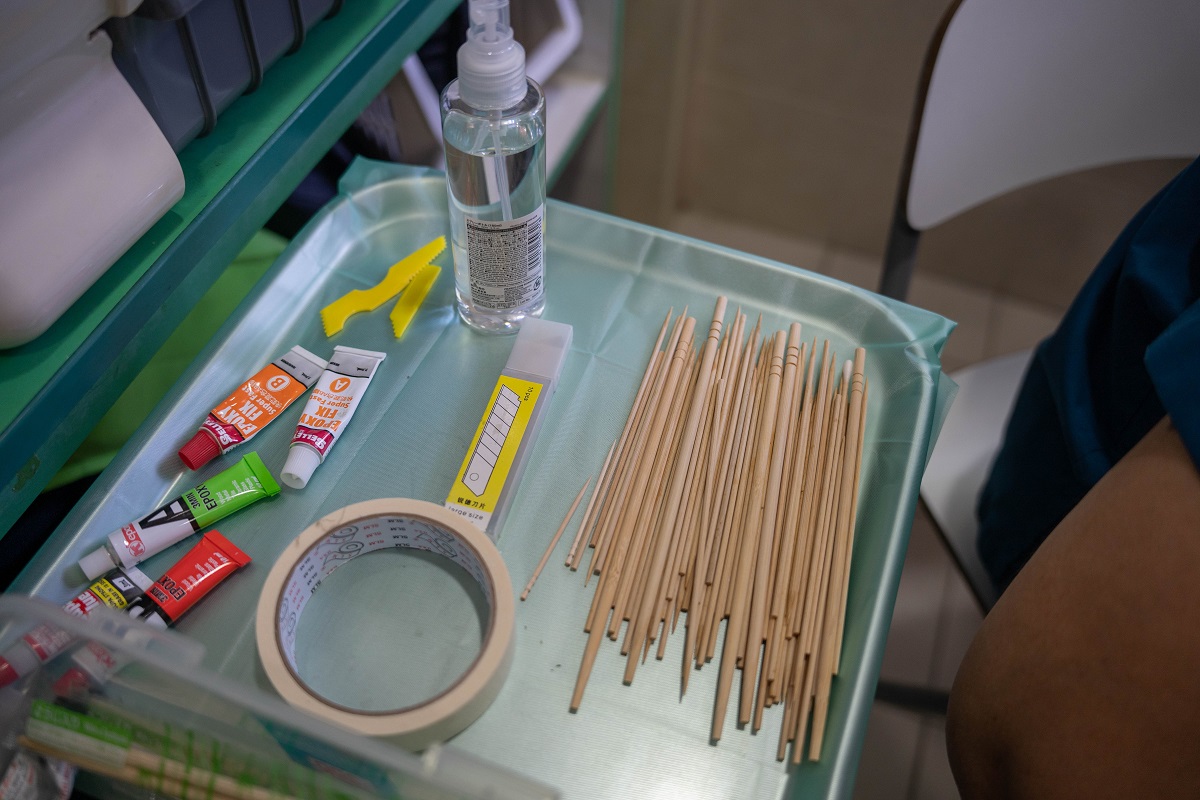 Tools of the trade include bamboo chopsticks which function as imping needles to connect the shafts of the new feathers to the damaged feathers. Epoxy, which is safe for the bird, is used to ensure the new feathers are securely affixed.