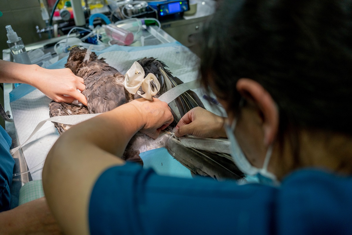 After the procedure, senior veterinary nurse Marcus Tan secures the bird in his arms while waiting for it to recover from anesthesia, while veterinary nurse, Keiko Watanabe, keeps the bird warm with hot air from a hair dryer.