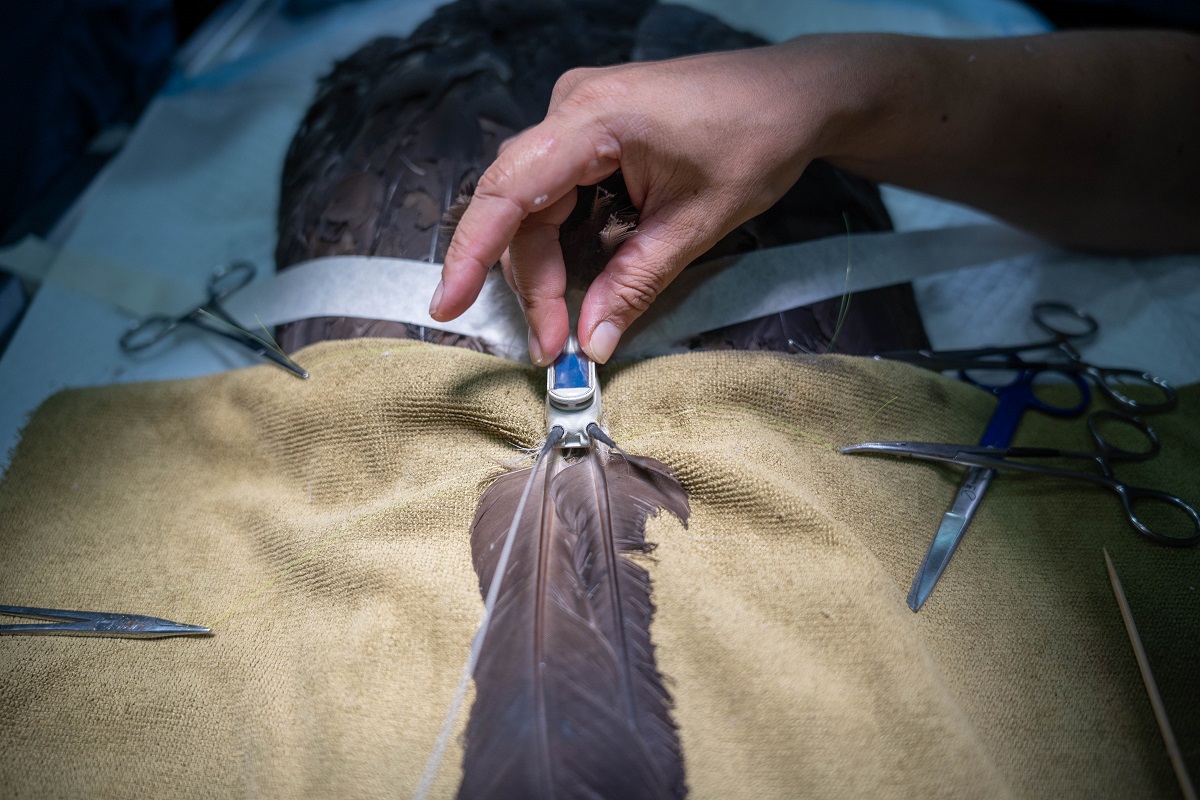 Dr Ellen Rasidi tests the fit of one of the donor’s secondary feathers on the bird’s right wing. It was a painstaking process of replacing over 50 feathers on the bird’s wings and tail.
