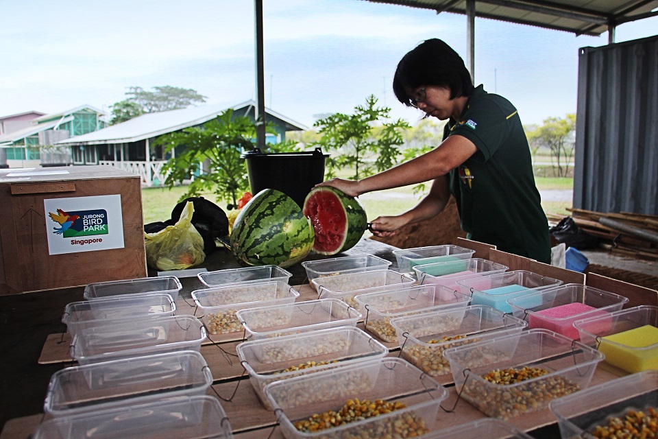 Dr Neo Peici preparing the doves’ in-flight meals, which consisted of water, maize and watermelon slices.