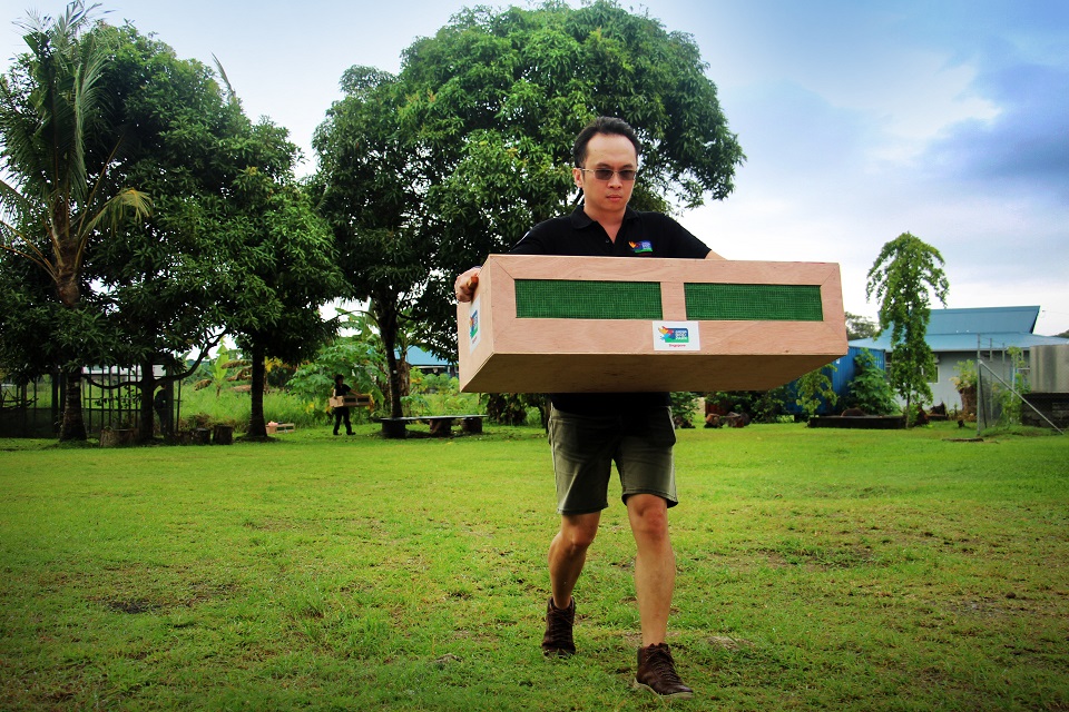 All packed and ready to go. Assistant Curator Mr Ivan Choo carrying one of the seven crates containing the endangered doves, out of the Solomon Islands’ biosecurity compound. Sixty doves departed for Singapore on 10 August.