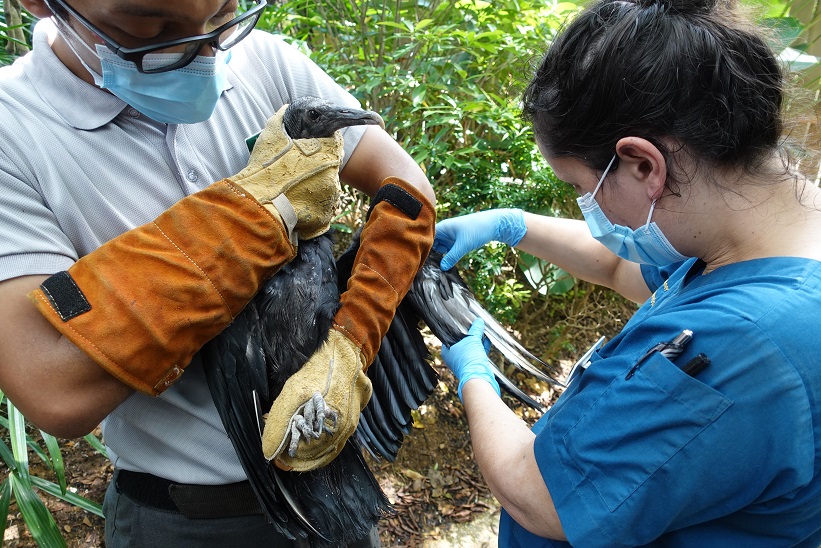 Dr Ellen Rasidi, veterinarian, gives Jose the American black vulture a physical check and blood draw while Senior Trainer Syawal Bin Safi’ee holds onto the bird before releasing it into its new home in the retirement aviary.