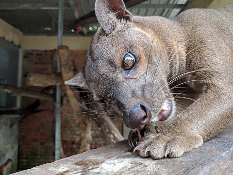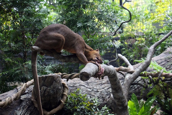 Varus, Singapore Zoo’s nine-year-old male fossa ripping off pieces of meat tied onto one of the dynamic branches which are part of exhibit design. Contrary to older, static designs, dynamic branches are spring loaded and sway with the animal’s weight, replicating the way natural branches behave.
