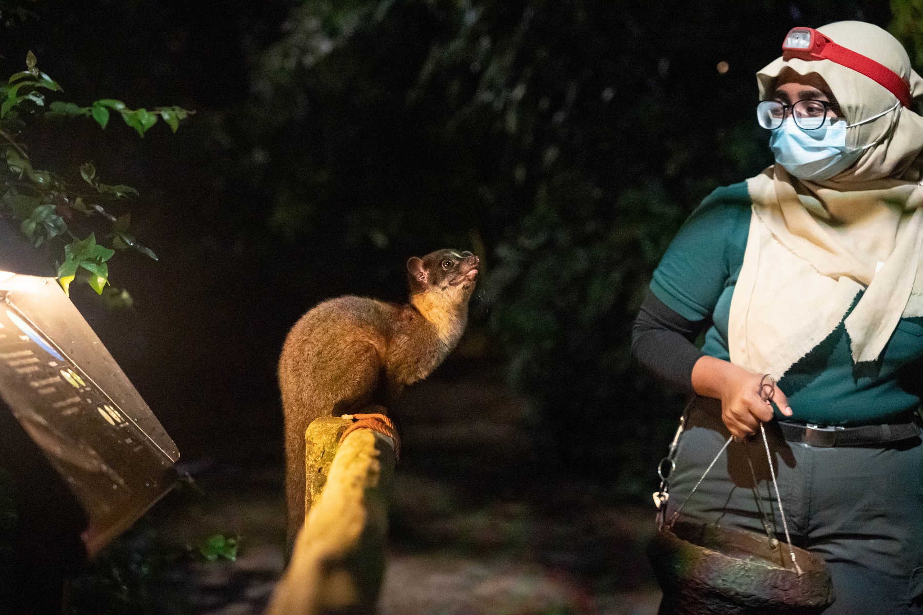 A young Small-toothed Palm Civet looks on curiously as Night Safari keeper, Noor Najilah Binti Anifah prepares to hang a feeder with the civet’s favourite treats. Feeders will be hung strategically in brighter areas of the exhibits where guests can observe the animals.