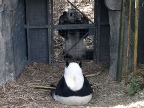 LEFT: Kai Kai putting on a show for Jia Jia, who sits munching bamboo. The cover of the crossing gate—which separates the pandas’ exhibits and is normally closed—was removed to allow them to steal peeks at each other and pique their interest ahead of mating season.
