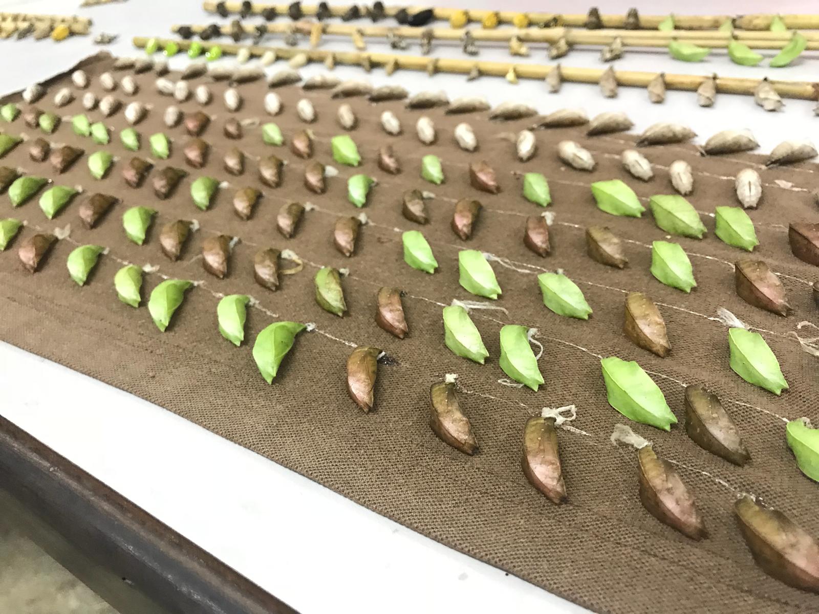 Within these chrysalis, Clipper butterflies wait to emerge at Fragile Forest’s behind the scenes area. This is the third stage in a butterfly’s life cycle. Once the butterflies emerge, they are transferred to the new butterfly aviary. Depending on the species, the life cycle of a butterfly may take anywhere from one month to a whole year.