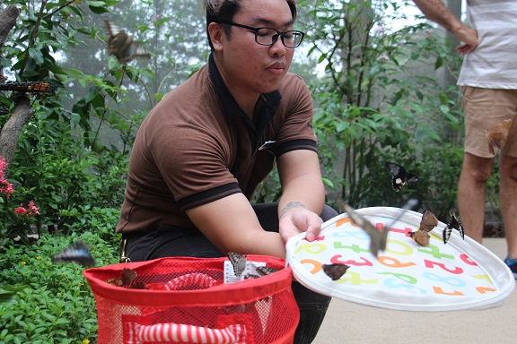 Invertebrate keeper Evan Lee coaxes the newly-emerged butterflies to leave the comfort of the basket and fly free in the Fragile Forest butterfly aviary.