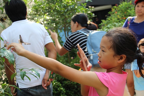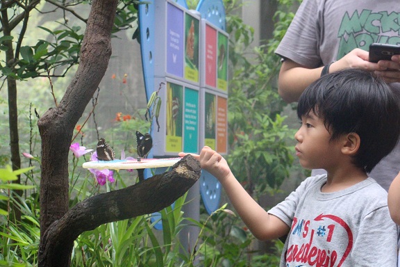 A young guest at Fragile Forest’s new butterfly aviary looks on curiously while butterflies feed from a feeder.