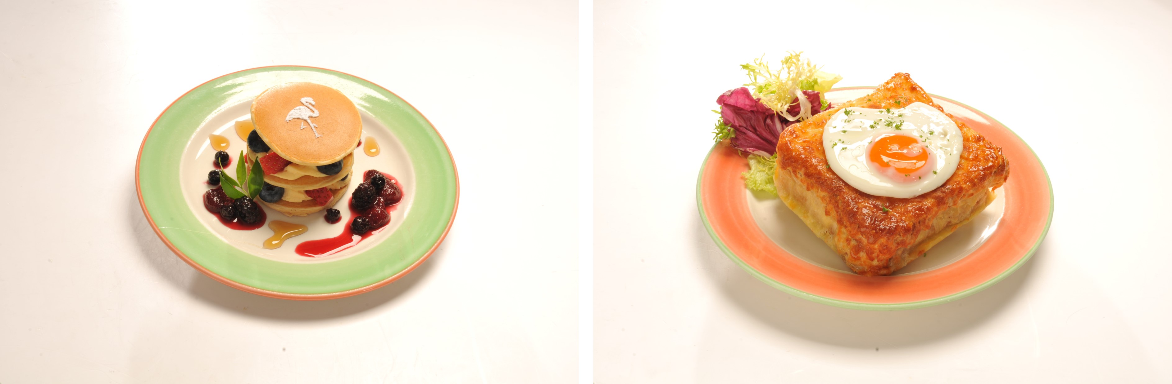 Sunrise Easter Brunch Menu at Crimson restaurant and Egg-cellent Easter Breakfast at Bird Bakery available from 9 – 31 March 2024 (Weekends, Public holidays & School holidays only). Pictured here are the Crimson Kid’s Hearty Fruit Pancake (left) and the Turkey Ham & Cheese Croque Madame from Bird Bakery (right).