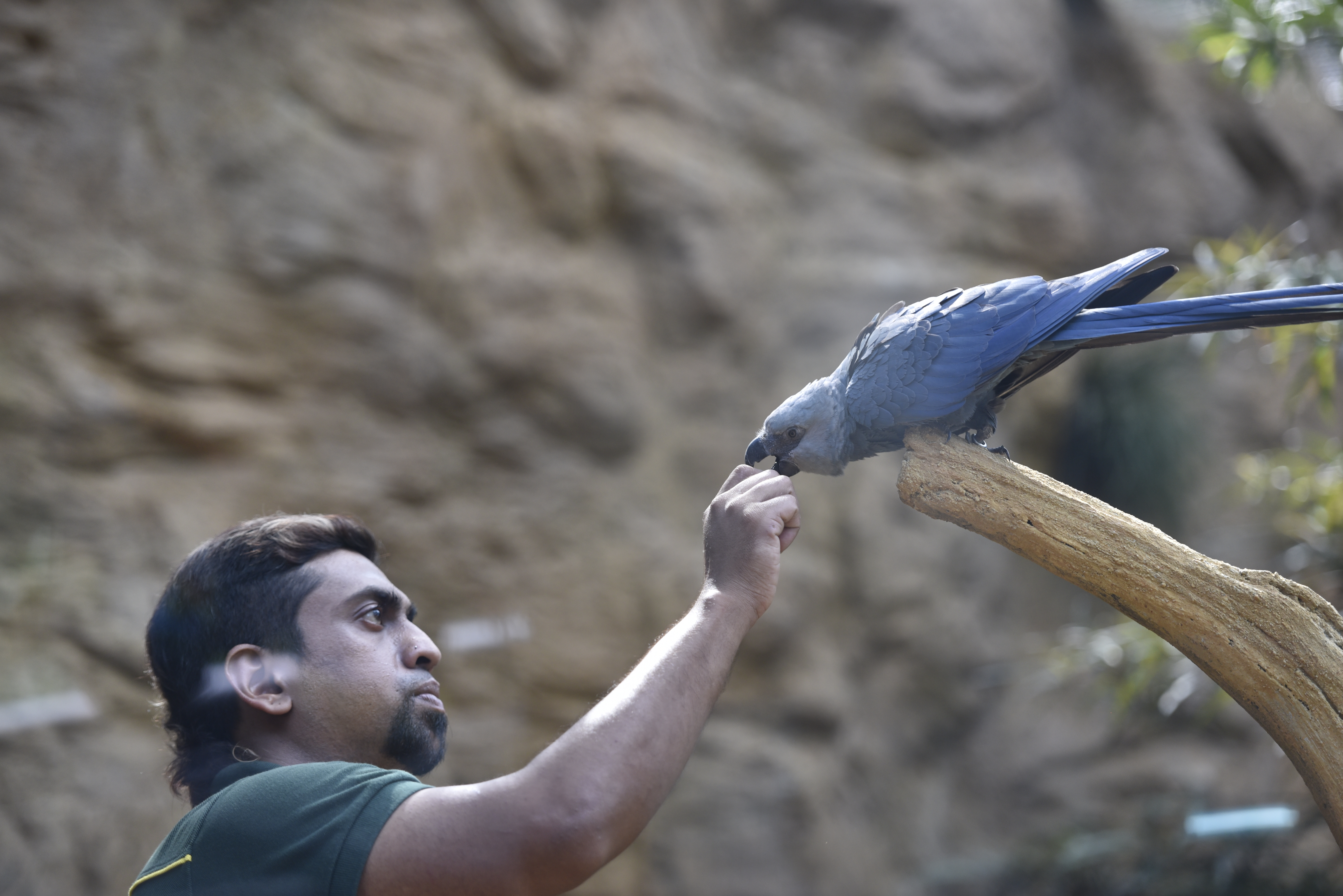 Image: Avian keeper Puvaneswaran s/o Kalaichelvan feeding the critically endangered Spix's Macaw.