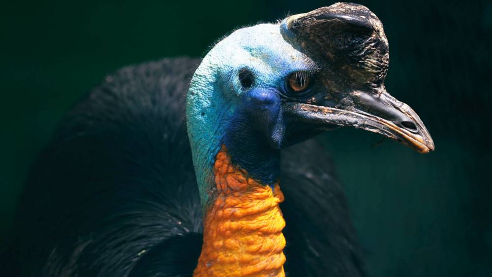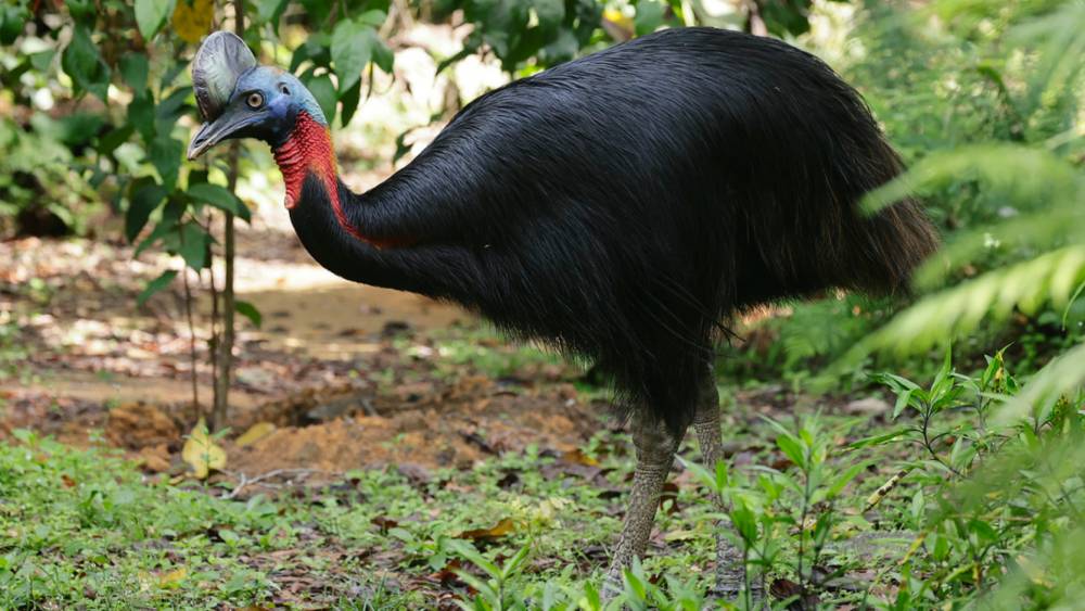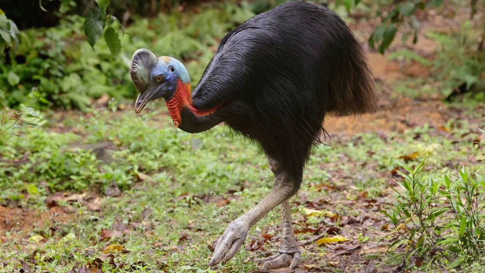 This flightless fowl can run at 50 kilometers (30 miles) per hour through dense undergrowth, leap 2 m (7 ft) into the air, and even swim. Unlike its cousin the Emu, it is shy, solitary and seldom seen in its forest home, where it forages for fallen fruits.