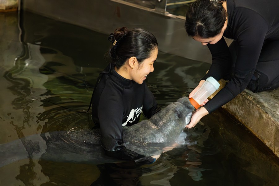 The younger calf also received special care as first-time mum Leandra faced challenges with nursing. Our aquarists stepped in with supplemental feeding, and the baby has recently started suckling. She’s expected to wean off formula milk soon.