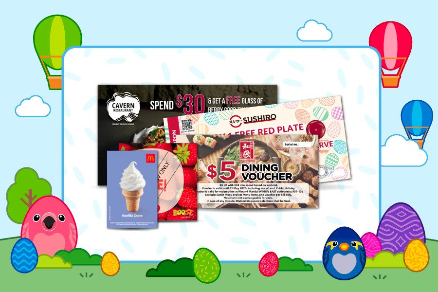 Guests must present a valid same-day admission ticket or membership e-card to Bird Paradise, Singapore Zoo, or Curiosity Cove, along with proof of completion of the Easter activities, to redeem a gachapon token/spin.