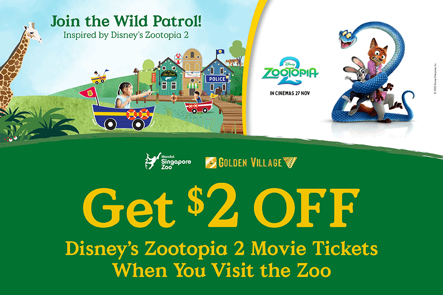 Limited-time only Bundle: Enjoy family fun with 1 Adult and 1 Child Admission for just $75* (U.P. $102) plus a Mandai-exclusive Zootopia 2 Plush Keychain – only at the Singapore Zoo!