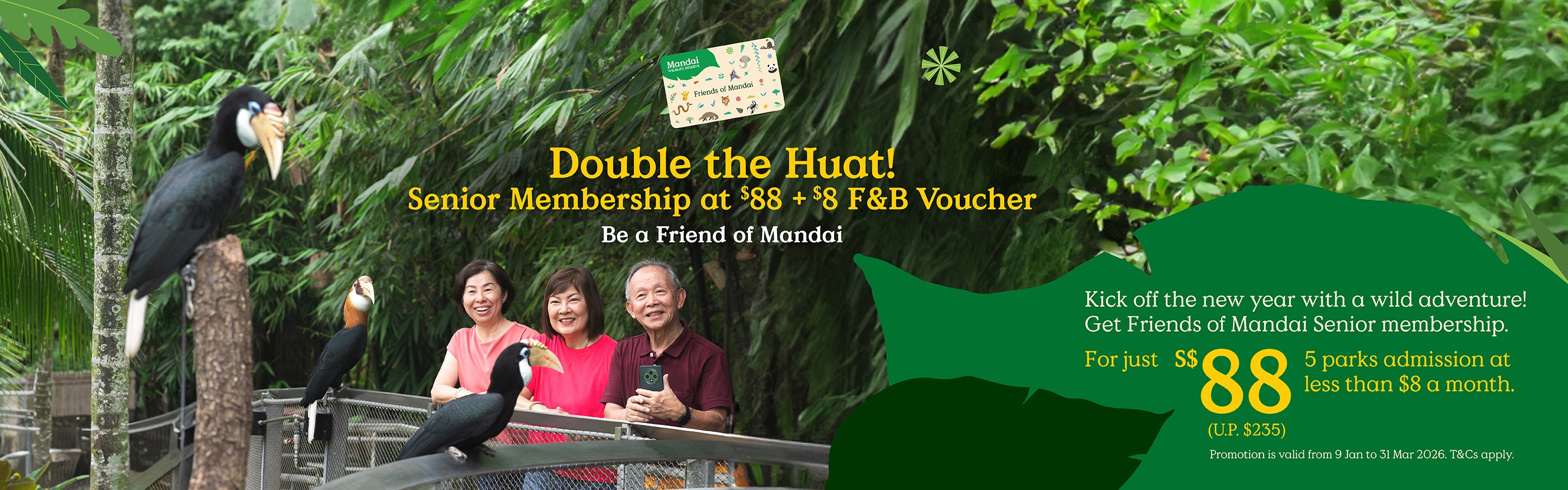 Enjoy annual admission to Bird Paradise, Singapore Zoo, Rainforest Wild ASIA, River Wonders and Night Safari. Tram at Singapore Zoo and in-park shuttle at Bird Paradise are included in your membership. Blackout dates applicable on second day of Chinese New Year, Labour Day and Hari Raya Puasa.