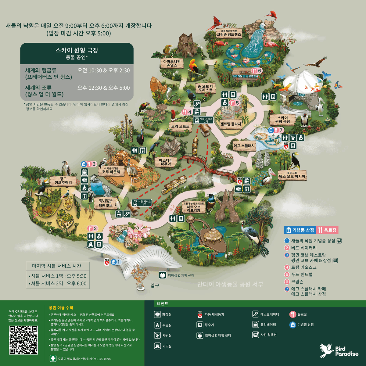 17헥타르에 달하는 새들의 낙원에는 400종이 넘는 새와 3,500마리 이상의 새들이 살고 있으며, 8개의 대형 테마형 산책형 조류장이 있습니다. 각 조류장은 전 세계 다양한 생물군계의 특징 식생, 조류를 반영합니다. 오늘 새들의 낙원으로 날아오세요!